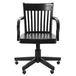 Understated and elegant, this hardwood swivel office chair adds class and style to any office. The retro styling takes its inspiration from early 1900 Mission-style furnishings with its curved arms, wide seat and slatted back. The adjustable-height base is supported by 5 legs, each with casters for easily gliding between desk, computer and files. The base features a 360° spin. Imported. 35Hx20W".