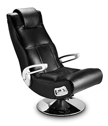 The hardwood frame of the ergonomically-friendly chair is covered by double layers of fire-retardant foam. Adjustable, brushed aluminum arm rests further increase comfort and support. Swiveling on a brushed aluminum cone-shaped pedestal base, the chair seat tilts to the user’s preferred angle. For compact storage, the chair’s body folds in half. The black vinyl exterior wipes clean with a damp cloth. Should the chair get wet, disconnect the power until entirely dry to avoid electrical shock. The manufacturer recommends that individuals with heart problems consult a doctor before using the gaming chair, and parents should supervise children under 13. Made in China, the chair holds up to 300 pounds. A 30-day limited warranty covers this item. The 24-by-36-1/4-by-24-inch chair weighs 33 pounds.