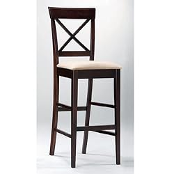 Dimensions: 17"W x 20"D x 47"H.Finish: Rich Cappuccino, Deep Mocha. Material: Solid Hardwood, Veneer, Microfiber. Set of 2 30"H Bar Stools with Cross Back Rich Cappuccino Finish. Features cross back design and durable microfiber seat in a deep mocha. finish.Clean lines and contemporary style.Smooth design and rich coloring is sure to embellish any home environment.Stylish, elegant and a perfect timeless design to your dining room.Matching counter height dining table is available separately.Assembly required.