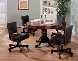 Three-in-One Solid Cherry Wood Pool Poker Game Dining Table Chairs set This is a brand new designer 5 pieces "three in one" game table set with 4 matching oak chairs. The game table features 42" of playing surface, and can be transitionally changed between 3 settings: bumper pool table, poker table, or dining table. The pool sticks and balls are included in the set. The price shown is for the game table and 4 matching solid oak chairs. This set is elegantly styled for an enhanced American feel, and it is exactly what every gaming enthusiast needs in their home. The seat is of a black color with a thick cushion for optimal look and comfort. The construction of all pieces is superb, with quality solid oak wood pieces made to last and be durable for all your dining and family fun needs. Assembly is required. Note: The price is quoted for 5 pieces set of one table and 4 arm chairs. Chairs do not come with gas lift. Specifications - Dimensions: Each Chair - 23"L x 25"W x 33"H, Table - 47 1/2"L x 47 1/2"W x 30"H. This set is an oversized freight delivery, which will be curbsided only (no inside delivery). Depending on your area, it may take up to 14 days to deliver your furniture. We will request the freight company to contact you in advance.