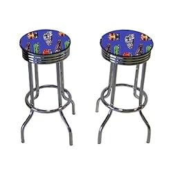 These are new 29'' chrome barstools that have footrests and a swivel seat. The seats feature Blue Freight Train upholstery. The sides of the seat have nice metal work and there are feet protectors on the bottom of each leg. These are great for kitchen or shop, or spread around a game room or patio setting. In this listing you will receive 2 chrome bar stools!