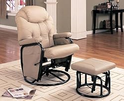 BONE LEATHERETTE GLIDER ROCKER THAT RECLINES WITH OTTOMAN.HAS 2 SIDE POCKETS ONE ON EACH END GREAT FOR THE REMOTE AND TV GUIDE.CHAIR SIZE:36-1/2"W X 28-1/4"D X 41-3/4 HOTTOMAN 18-1/2" X 16-1/2" W X 14-1/4"H